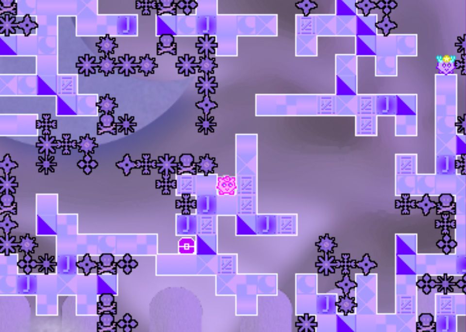 JIGGLY ZONE's world is made up of just two types of objects: deadly blocks and solid blocks, and so the substance of the game is just the particular placement of these blocks in each level. At first glance, the placement seems haphazard and almost random. But as you inch through the world, placing checkpoints and forming hypotheses about which jumps are makeable and which are not, you realize every single block has been placed with great care and ambition. The level design starts simply enough but it progressively guides you through the details of the mechanics with a level of granularity I have never seen before: how high is my third double-jump? How much height do I lose if I jump into the ceiling? By the end of the game, it has become the most technical and original platformer I can remember playing, but it is all in the arrangement of the blocks.