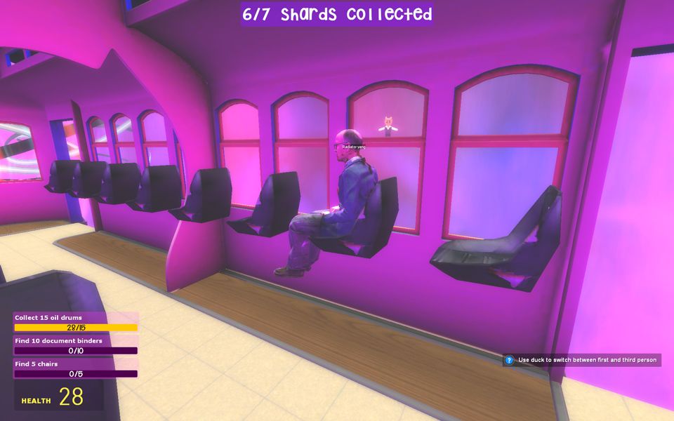 The game opens with a custom setpiece that sets up the main conceit of the game: interdimensional thieves want you to help them salvage materials from videogame levels across the conceptual multiverse that is the Steam Workshop. You take a bus to a level from an actual videogame (or more often, a mod of an actual videogame) and start stealing all the props from it, using a magical stick that warps the props away into your inventory. Once everything in the area has been seized and pawned, you get back on the bus and go the next dimension. In the fiction of the game, you're an unchained entropic force, strip-mining the collective cultural works of the medium of games in exchange for goofy cutscenes.